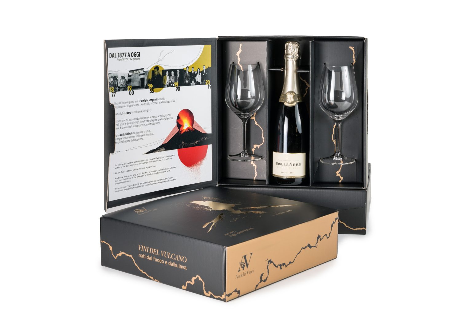 A prestige cardboard gift box to help you discover the sparkling wines made from volcanic Nerello Mascalese.